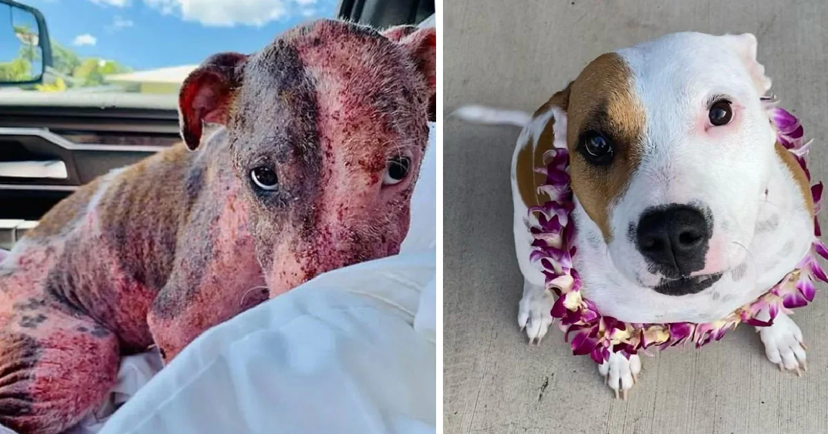 The dog – later named Leialoha – was found in dire condition. Severely sunburned, covered in sores, and missing patches of fur, she also had visible injuries on her legs. Rescuers immediately transported her to Aloha Affordable Veterinary Services for urgent medical care.